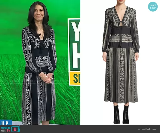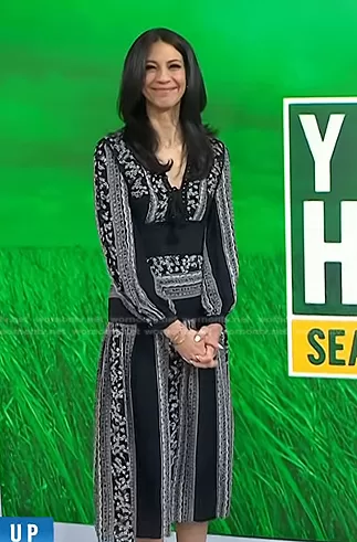 Dr. Natalie Azar on Today on NBC was spotted wearing this black embroidered midi dress on Today on May 19 2023's episode. Natalie A's Dress is the Keely Long-Sleeve V-Neck Paneled Floral-Print Midi Dress by Sea.