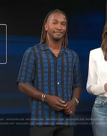 Scott Evans on Access Hollywood on NBC was spotted wearing this blue checked shirt on Access Hollywood on May 30 2023's episode. Scott's Shirt is the Navy & Blue Geo Box Print Camp Shirt by Paul Smith.