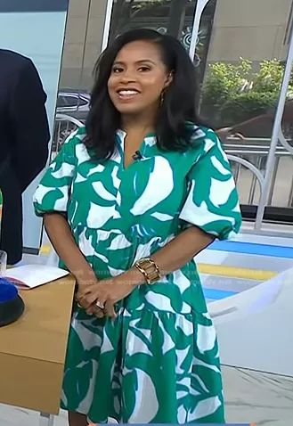 Sheinelle Jones on Today on NBC was spotted wearing this green and white printed dress on Today on Jun 06 2024's episode. Sheinelle's Dress is the Green Leaf Print Poplin Dress by Chico's.