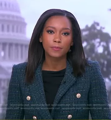 Rachel Scott on Good Morning America on ABC was spotted wearing this green tweed blazer on Good Morning America on May 19 2023's episode. Rachel's Jacket is the Kaya Tweed Blazer by Generation Love.