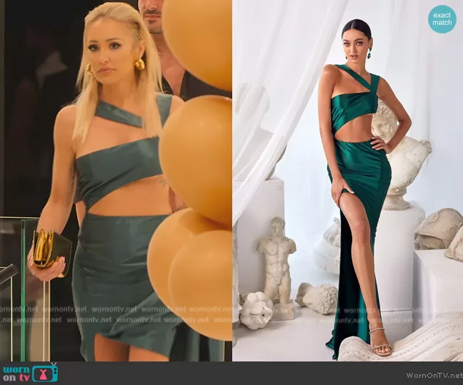 Mary Fitzgerald on Selling Sunset on Netflix was spotted wearing this teal satin cutout dress on Selling Sunset on episode 'I Wanted to Hate You' (6x01) in May 2023. Mary's Dress is the Vera Dress by Alamour the Label.