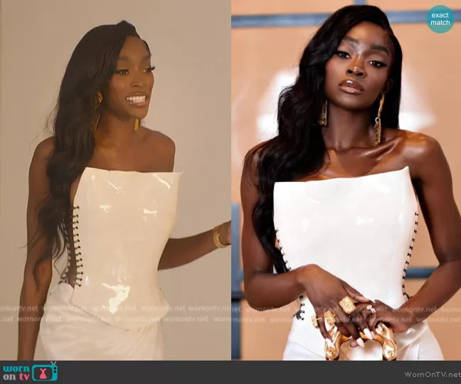 Chelsea Lazkani on Selling Sunset on Netflix was spotted wearing this gold metallic carry bag on Selling Sunset on episode 'I Wanted to Hate You' (6x01) in May 2023. Chelsea's Corset is the Custom Corset by Nicole Moan . Chelsea's Bag is the Mini Intersex Bag by Stef Van Looveren.