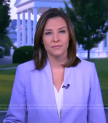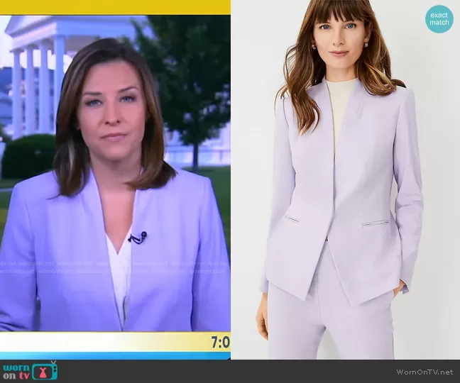 Mary Bruce on Good Morning America on ABC was spotted wearing this lilac open jacket on Good Morning America on May 22 2023's episode. Mary's Jacket is the The Cutaway Blazer in Bi-Stretch by Ann Taylor.