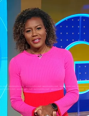 Janai Norman on Good Morning America on ABC was spotted wearing this pink ribbed colorblock dress on Good Morning America on May 22 2023's episode. Janai's Dress is the Frankie Dress by Line + Dot.