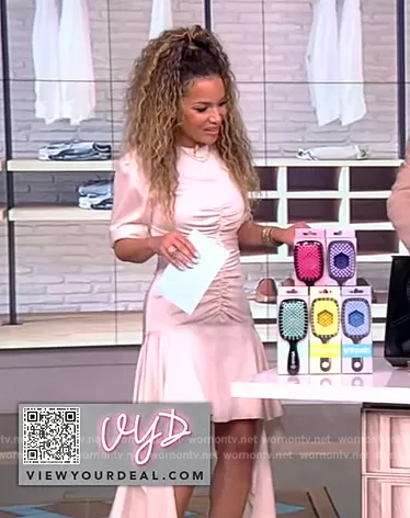 Sunny Hostin on The View on ABC was spotted wearing this white ruched front dress on The View on May 22 2023's episode. Sunny's Dress is the whitney Short Dress by Aknvas.