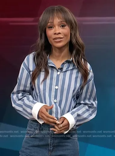 Zuri Hall on Access Hollywood on NBC was spotted wearing this blue stripe shirt on Access Hollywood on May 30 2023's episode. Zuri's Top is the Stripe Crop Shirt by Sandro.
