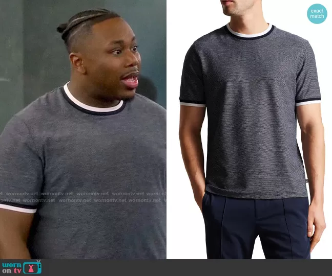 Marty (played by Marcel Spears) on The Neighborhood on CBS was spotted wearing this striped trim t-shirt on The Neighborhood on episode 'Welcome to the Opening Night' (5x22) in May 2023. Marty's Shirt is the Bowker T-shirt by Ted Baker.