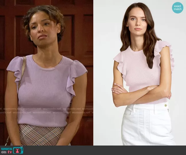 Elena Dawson (played by Brytni Sarpy) on The Young and the Restless on CBS was spotted wearing this lilac ruffle sleeve top on The Young and the Restless on May 23 2023's episode. Elena's Top is the Rib Flutter Shoulder Crew by Autumn Cashmere.