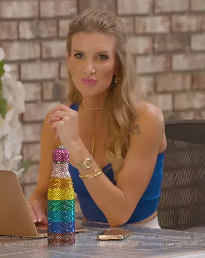 Nicole Young on Selling Sunset on Netflix was spotted wearing this blue bandage crop top on Selling Sunset on episode 'TBD on Bre' (6x02) in May 2023. Nicole's Top is the Jay Bandage Crop Top and Mini Skirt Set by Bodycon Collection . Nicole's Drink Bottle is the Crystal Quench Water Bottle by Kurt Geiger.