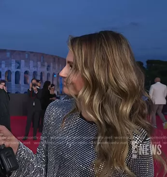 on E! News on E! was spotted wearing this embellished mini dress on E! News on May 15 2023's episode. 's Dress is the Cutout Long Sleeve Crystal Mesh Minidress by Mach & Mach.