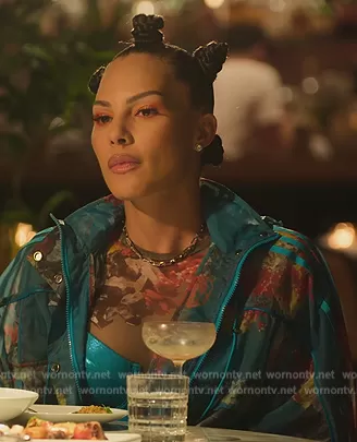 Amanza Smith on Selling Sunset on Netflix was spotted wearing this blue floral sheer trench coat on Selling Sunset on episode 'TBD on Bre' (6x02) in May 2023. Amanza's Coat is the Blue Printed Coat by Adidas x Ivy Park . Amanza's Bag is the Mini La Medusa Chain Leather Top Handle Bag by Versace.