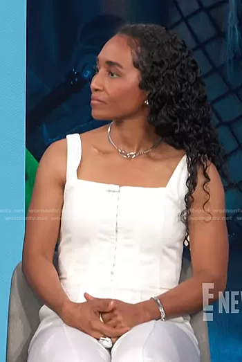 on E! News on E! was spotted wearing this white corset jumpsuit on E! News on May 23 2023's episode. 's Jumpsuit is the Chels Corset Denim Jumpsuit by Alice + Olivia.