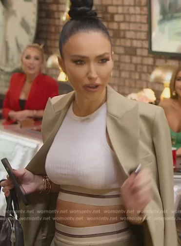 Bre Tiesi on Selling Sunset on Netflix was spotted wearing this white stripe trim cropped top on Selling Sunset on episode 'Old Deals Die Hard' (6x03) in May 2023. Bre's Top is the Rib Crop Tank by Helmut Lang.