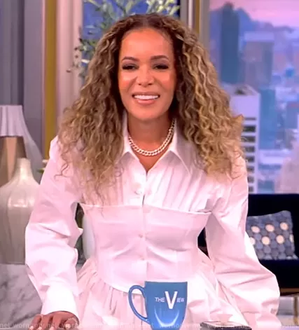 Sunny Hostin on The View on ABC was spotted wearing this white corset shirtdress on The View on May 24 2023's episode. Sunny's Dress is the Corset-style shirt dress by AWAKE Mode.