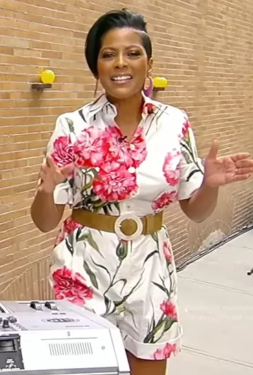 Tamron Hall on Tamron Hall Show on ABC was spotted wearing this white floral print romper on Tamron Hall Show on May 24 2023's episode. Tamron's Romper is the Carnation Print Cotton Poplin Romper by Dolce & Gabbana.