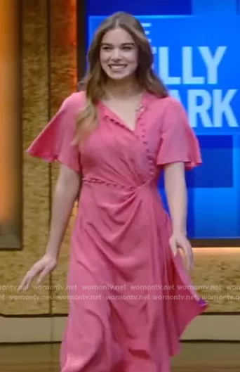 on Live with Kelly and Mark on Disney ABC Home Entertainment was spotted wearing this pink button down wrap dress on Live with Kelly and Mark on May 24 2023's episode. 's Dress is the Flutter Sleeve Button Waist Dress by Prabal Gurung.