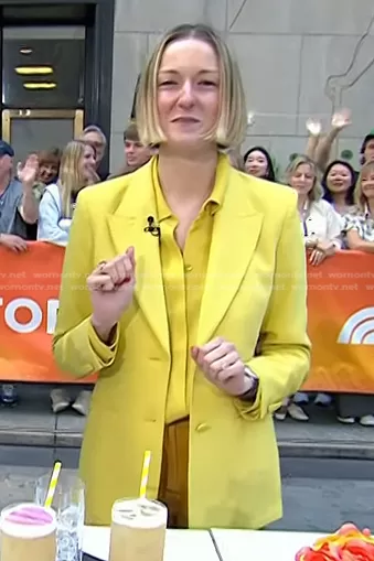 on Today on NBC was spotted wearing this yellow blouse and blazer on Today on May 24 2023's episode. 's Top is the Scottie Silk Blouse by Lafayette 148 New York . 's Jacket is the Finesse Blazer by Lafayette 148 New York.