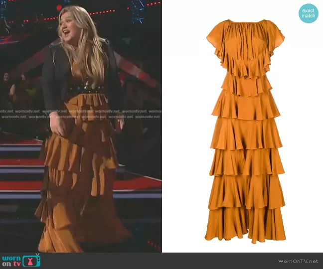 Kelly Clarkson on The Voice on NBC was spotted wearing this orange tiered maxi dress on The Voice on May 16 2023's episode. Kelly C's Dress is the Freja Ruffled Silk Maxi Dress by Ulla Johnson . Kelly C's Belt is the Embellished Leather Belt by Balmain . Kelly C's Earrings is the Bridge Dangle Earrings by Free People.