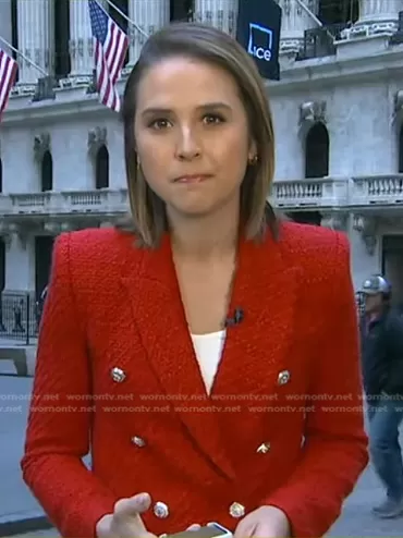 Elizabeth Schulze on Good Morning America on ABC was spotted wearing this red tweed blazer on Good Morning America on Nov 17 2023's episode. Elizabeth's Jacket is the Textured Double Breasted Blazer by Zara.