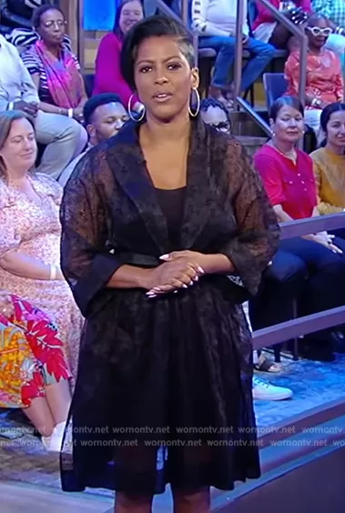 Tamron Hall on Tamron Hall Show on ABC was spotted wearing this black sheer floral dress on Tamron Hall Show on May 25 2023's episode. Tamron's Dress is the Silk Taffeta Sheer Topper Dress by Alaia.