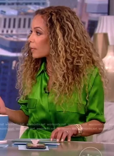 Sunny Hostin on The View on ABC was spotted wearing this green satin utility dress on The View on May 25 2023's episode. Sunny's Dress is the Klement Cargo Pocket Dress by L'Agence.