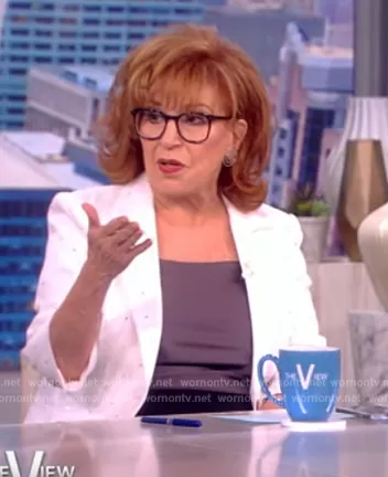 Joy Behar on The View on ABC was spotted wearing this white rhinestone embellished blazer on The View on May 25 2023's episode. Joy's Blazer is the Ditsy Rhinestone Khloe Blazer by Cinq a Sept.