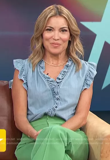 Kit Hoover on Access Hollywood on NBC was spotted wearing this blue ruffle trim chambray top on Access Hollywood on May 25 2023's episode. Kit's Top is the Cotton Sleeveless Ruffle Top by Elan . Kit's Pants is the Livi Wide Leg Pants in Parrot by Alice + Olivia.