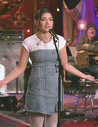on The Voice on NBC was spotted wearing this strapless striped mini dress on The Voice on May 20 2023's episode. 's Dress is the Strapless Striped Dress by Zara.