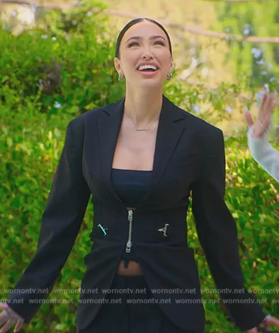 Bre Tiesi on Selling Sunset on Netflix was spotted wearing this black zip front blazer on Selling Sunset on episode 'Mary In The Middle' (6x06) in May 2023. Bre's Blazer is the La Veste Filu belted wool blazer by Jacquemus . Bre's Pants is the Le Draio straight-leg trousers by Jacquemus.