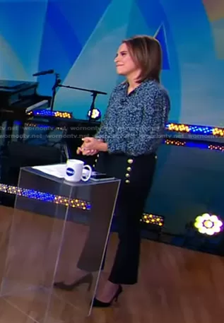 Elizabeth Schulze on Good Morning America on ABC was spotted wearing this navy cropped pants with gold buttons on Good Morning America on May 07 2024's episode. Elizabeth's Pants is the Robertson High Waisted Crop Flare Pants by Derek Lam 10 Crosby.