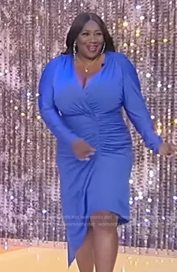 on Tamron Hall Show on ABC was spotted wearing this blue satin wrap dress on Tamron Hall Show on May 26 2023's episode. 's Dress is the Mira Draped Jersey Midi-Dress by Ungaro.