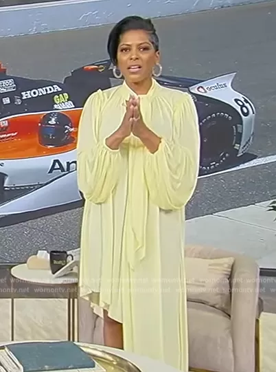Tamron Hall on Tamron Hall Show on ABC was spotted wearing this yellow asymmetric tie neck dress on Tamron Hall Show on May 26 2023's episode. Tamron's Dress is the Asymmetric midi dress by Loewe.