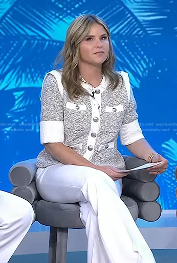 Jenna Bush Hager on Today on NBC was spotted wearing this knit short sleeve cardigan and white flare pants on Today on May 26 2023's episode. Jenna's Jacket is the Kaufman Knit Jacket by Veronica Beard . Jenna's Pants is the Judy Flare Hem Pants by Veronica Beard.