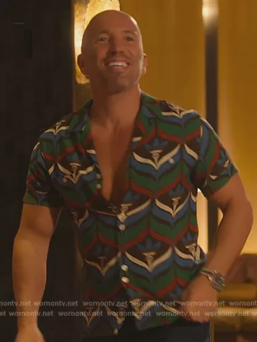 Jason on Selling Sunset on Netflix was spotted wearing this printed shirt on Selling Sunset on episode 'If You Can't Stand The Heat...' (6x07) in May 2023. 's Shirt is the Trefoil Print Bowling Shirt by Gucci x adidas.