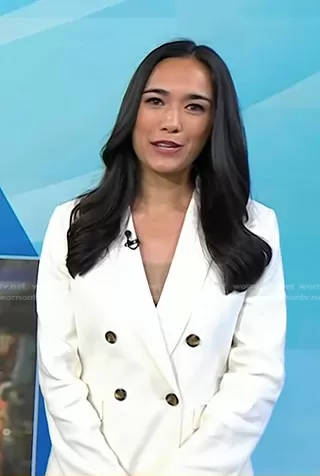 Emilie Ikeda on Today on NBC was spotted wearing this white double breasted blazer on Today on Aug 16 2024's episode.