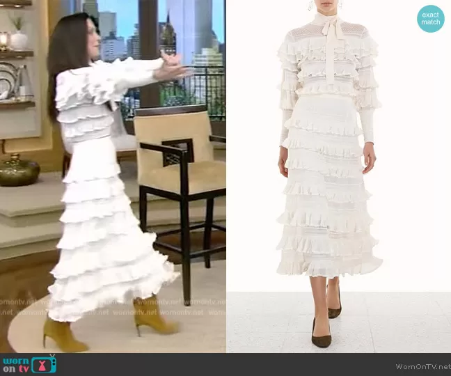 on Live with Kelly and Mark on Disney ABC Home Entertainment was spotted wearing this white lace tie top and skirt on Live with Kelly and Mark on May 29 2023's episode. 's Top is the Tie Neck Lace Blouse by Zimmermann . 's Skirt is the Wonderland frilled-lace midi skirt by Zimmermann.