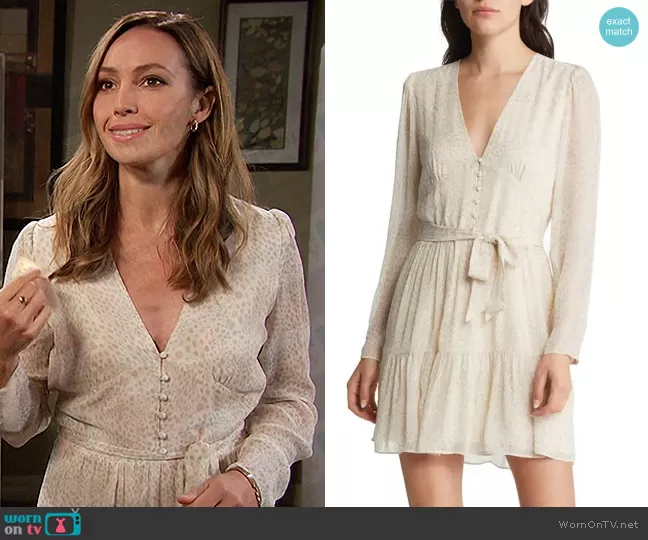 Gwen Rizczech (played by Emily O'Brien) on Days of our Lives on Peacock was spotted wearing this ivory leopard dress on Days of our Lives on May 30 2023's episode. Gwen's Dress is the Truett Tie Waist Ruffle Long Sleeve Silk Dress by Paige.