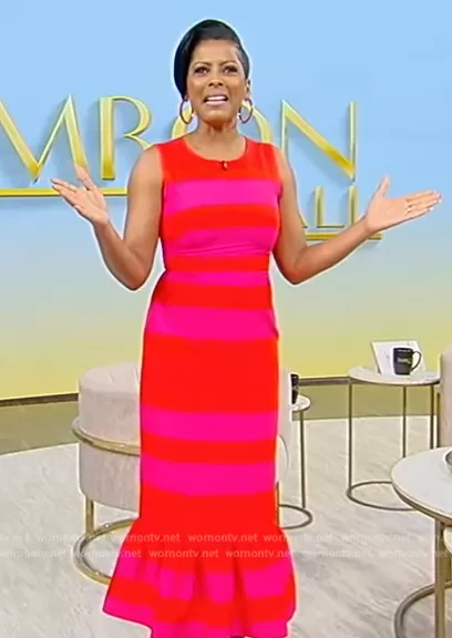 Tamron Hall on Tamron Hall Show on ABC was spotted wearing this red stripe sleeveless dress on Tamron Hall Show on May 30 2023's episode. Tamron's Dress is the Ruffled striped cotton and silk-blend faille midi dress by Brandon Maxwell.