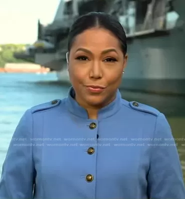 Stephanie Ramos on Good Morning America on ABC was spotted wearing this blue military jacket on Good Morning America on May 30 2023's episode. Stephanie's Jacket is the Knit Band Jacket by Talbots.