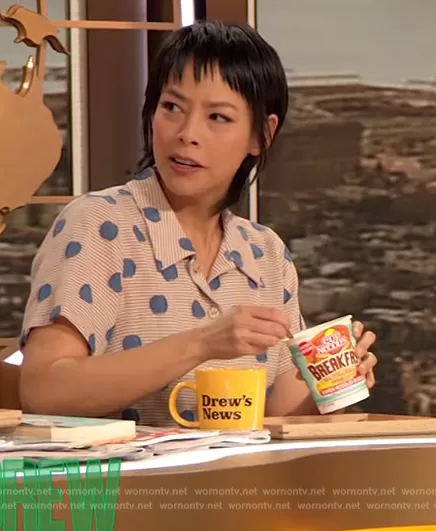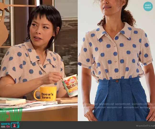 on The Drew Barrymore Show on CBS was spotted wearing this Pilar Valdes’s blue polka dot shirt on The Drew Barrymore Show on May 30 2023's episode. 's Top is the Johanson Shrit by Caron Callahan.