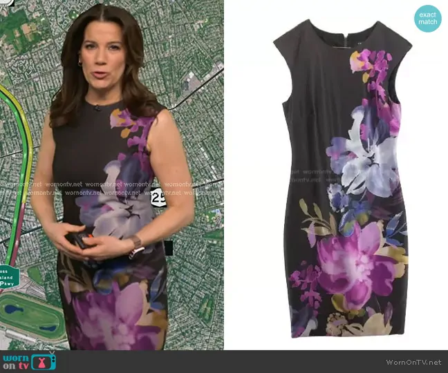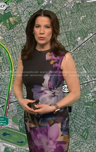 Heather O’Rourke on Good Morning America on ABC was spotted wearing this purple floral sleeveless dress on Good Morning America on Sep 15 2025's episode. Heather's Dress is the Floral Sheath Dress by Tahari ASL.