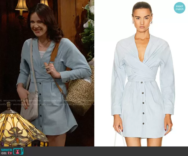 Tessa Porter (played by Cait Fairbanks) on The Young and the Restless on CBS was spotted wearing this blue wraparound dress on The Young and the Restless on May 30 2023's episode. Tessa's Dress is the Sandrine Dress in Chambray by Noam .
