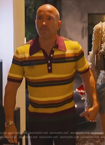 on Selling Sunset on Netflix was spotted wearing this yellow striped polo on Selling Sunset on episode 'Something's Gotta Give' (6x10) in May 2023. 's Top is the Striped Polo by Gucci x Adidas.