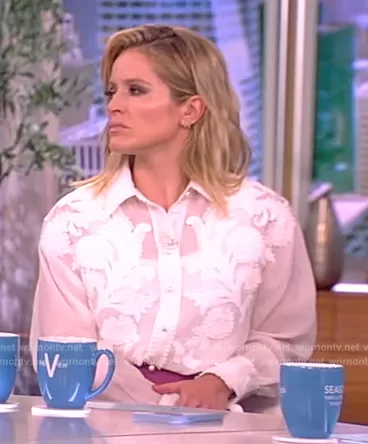 Sara Haines on The View on ABC was spotted wearing this white floral blouse on The View on May 31 2023's episode. Sara's Top is the Tama Filigree blouse by Zimmermann.