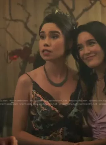 Addy (played by Rachel Colwell) on Nancy Drew on The CW was spotted wearing this floral lace trim dress on Nancy Drew on episode 'The Dilemma of the Lover's Curse' (4x01) in May 2023. 's Dress is the Luana Graphic-print Silk Midi Dress in Black/Pink by Sandro.
