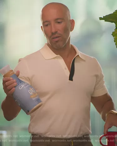 on Selling Sunset on Netflix was spotted wearing this white contrast polo on Selling Sunset on episode 'It's Not Worth It' (6x11) in Jun 2023. 's Shirt is the Logo Tape Piqué Polo Shirt by Alexander McQueen.
