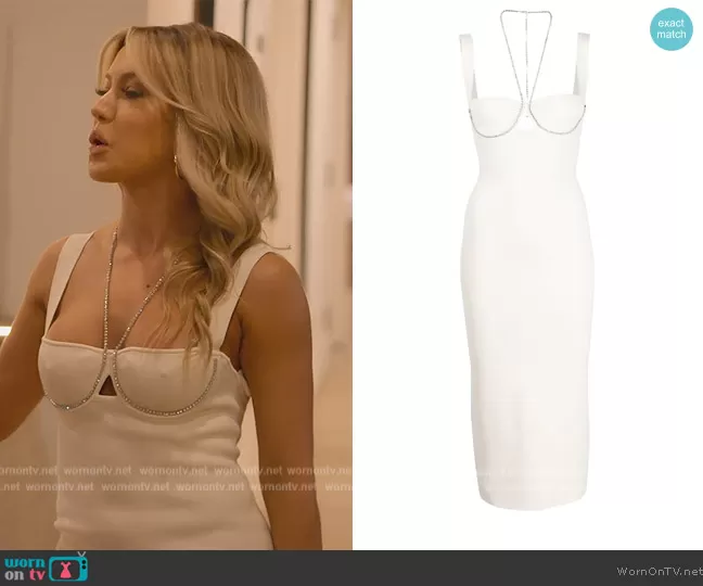 Lindsay on Selling Sunset on Netflix was spotted wearing this white crystal trim dress on Selling Sunset on episode 'It's Not Worth It' (6x11) in Jun 2023. 's Dress is the Celeste crystal-embellished midi dress by Galvan London.