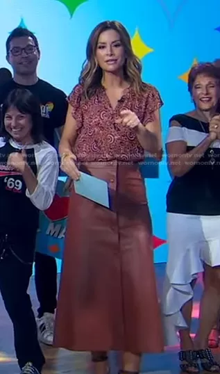Rebecca Jarvis on Good Morning America on ABC was spotted wearing this pink floral ruffle top and brown skirt on Good Morning America on Jun 01 2023's episode. Rebecca's Top is the June Silk Top by A.L.C. . Rebecca's Skirt is the A-line mid-length skirt by Chloe.