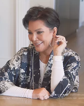 Kris Jenner (played by Kris Jenner) on The Kardashians on Hulu was spotted wearing this navy printed top and pants on The Kardashians on episode 'Don't Want It, Don't Need It, I'm Done.' (3x02) in Jun 2023. Kris's Set is the Constellation Print Pajama Set by Christian Dior.