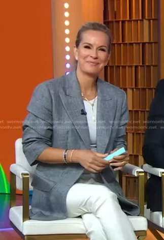 Dr. Jennifer Ashton on Good Morning America on ABC was spotted wearing this grey ruched sleeve blazer on Good Morning America on Jul 21 2023's episode. Jennifer's Jacket is the Linen Crush Sleeve Blazer by Michael Kors Collection.